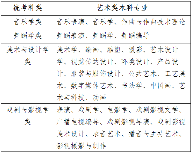 報考區內院校藝術類本科專業和所有高校的音樂學類、舞蹈學類、美術與設計學類高職(專科)專業(除中央戲劇學院、北京電影學院等教育部特別規定的藝術類高職專業) 的考生,不再參加院校組織的音樂學類、舞蹈學類、美術與設計學類專業的校考。