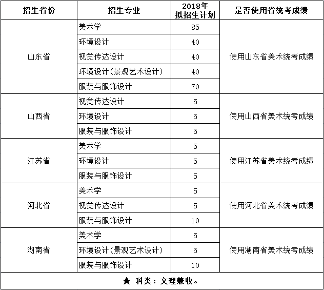 我校面向山東省招生的美術類本科專業使用山東省美術類專業統考成績,對進檔考生,美術學、視覺傳達設計、環境設計、環境設計(說明:景觀藝術設計方向)、服裝與服飾設計等專業按專業大類實行平行志愿,按照綜合分確定錄取專業(綜合分相同者,按文化課成績從高到低擇優錄取)。綜合分折算辦法分別為:美術類專業按專業成績占70%,文化成績占30%,折算形成綜合分(綜合分=專業成績*750/300*70%+文化成績*30%)。