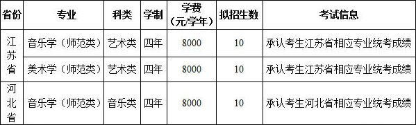江蘇省的美術(shù)學(師范類)、音樂學(師范類)專業(yè),河北省的音樂學(師范類)專業(yè)錄取原則:承認考生所在省相應專業(yè)統(tǒng)考成績,進檔考生按省統(tǒng)考成績由高分到低分錄取。統(tǒng)考成績相同時,優(yōu)先錄取高考文化成績高者。
