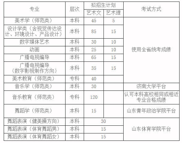 注:文理兼招的專業(yè)依據(jù)藝術(shù)文、理合格人數(shù)分列文理計劃。最終招生專業(yè)及計劃以山東省教育招生考試院公布為準(zhǔn)。