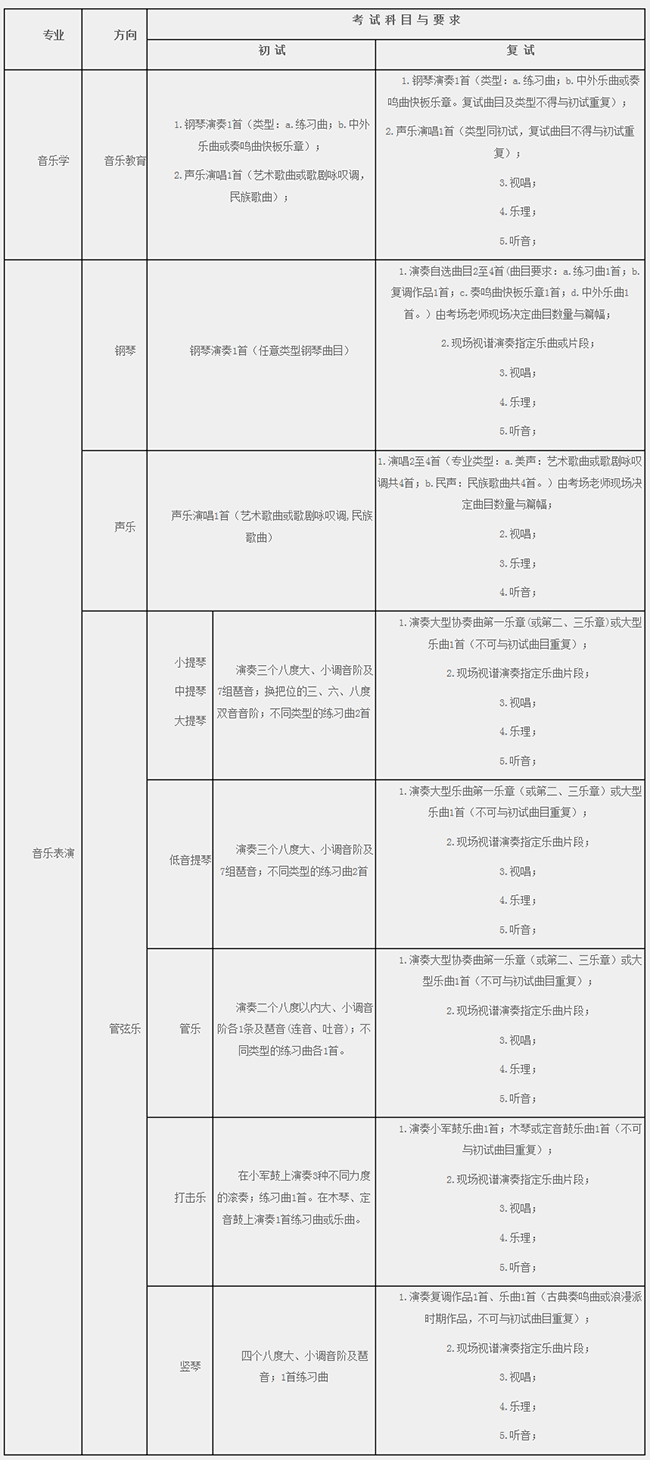 4、專業考試分為初試和復試。考試科目包括:專業、樂理、聽音、視唱,考試內容與要求詳見下表。