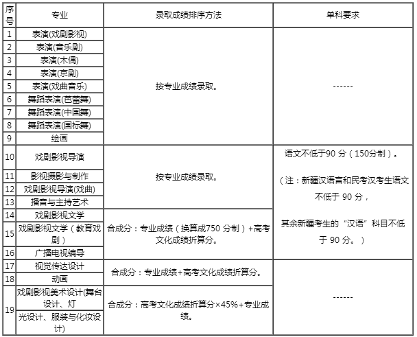 根據教育部關于普通高等藝術院校招生的相關規定,我校可根據各專業(方向)合格人數,參照招生計劃數,確定高考錄取控制分數線,具體辦法按照教育部教學廳[2017]15 號文件執行。凡我校專業考試合格,在我校高考錄取控制分數線以上的考生分別按以下辦法從高分到低分擇優錄取: