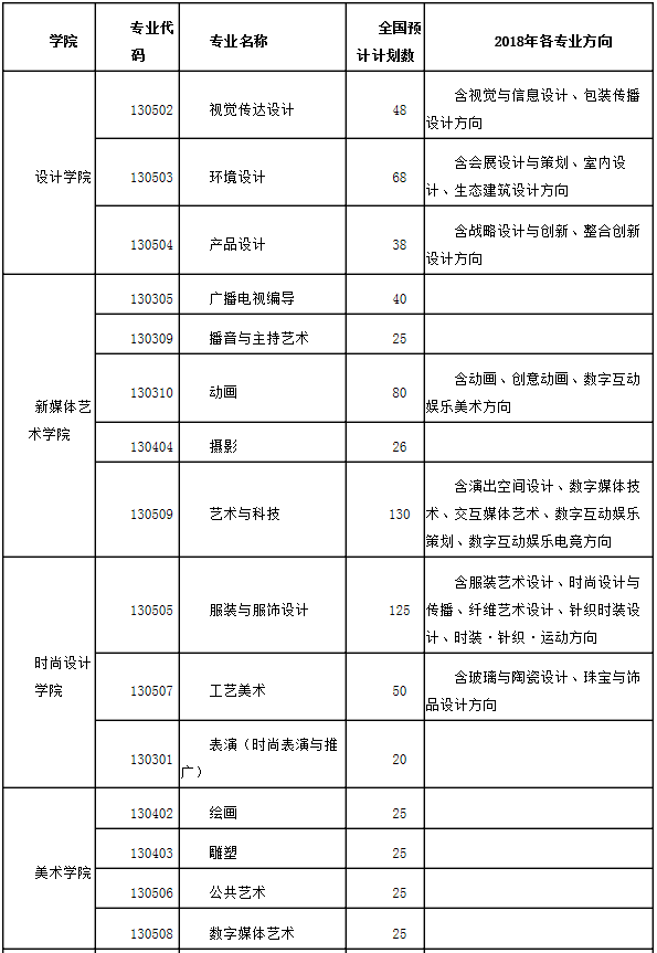 2018年,我校共有視覺傳達設計、產品設計、環境設計、藝術與科技、數字媒體藝術、動畫、攝影、廣播電視編導、播音與主持藝術、工藝美術、服裝與服飾設計、雕塑、繪畫、公共藝術、表演、文物保護與修復和文化產業管理等共17個專業,總計招生1080名(以教育主管部門批文為準)。