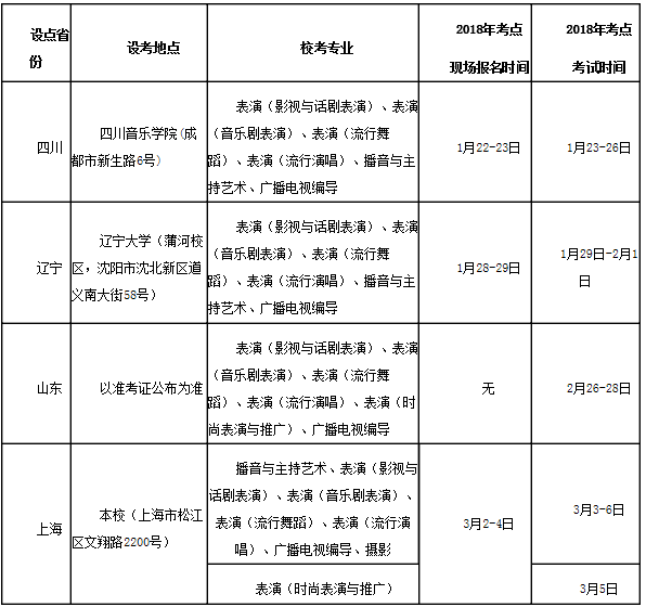 參加藝術類專業省級統考的考生,報名及考試辦法根據各省市的相關招考規定進行。參加我校??嫉目忌?,須在各省市相關招考規定的基礎上,依照我校規定進行報名和考試:請于2018年1月中旬登錄我校官網首頁【招生熱線】進行網上報名,并根據提示于2018年春節前后到沈陽、成都、青島、上海所設考點參加考試(請注意設考專業及報名方式)。山東考生若選擇青島考點,請至本省網上報考。部分省市對于已在本省設點??嫉南嚓P專業如有規定,請考生按照文件規定報名。攝影專業僅在我校本部設立考點。