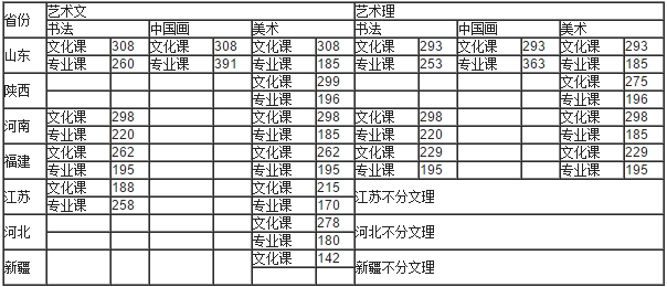 五、錄取 1.各省專業課“省統考”考試合格,江蘇省書法學專業、山東省書法學、中國畫專業、陜西省書法學、中國畫專業考生取得我院專業課測試合格證,政治思想品德和體檢合格,文化課考試成績達到各省規定的分數線的前提下,按專業課總成績從高到低擇優錄取。