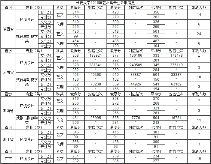 長安大學2017年藝術類共招收【環境設計】和【戲劇與影視學類(含廣播電視編導和戲劇影視文學)】2個專業(類)。