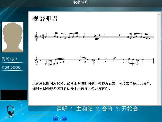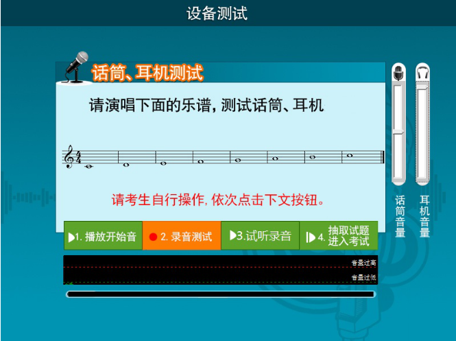2.錄音測試:在聽到“開始錄音”的語音提示后,考生對準話筒錄入測試音。當音量過高或過低時,系統會提示需重新錄音。考生可調節適當調整話筒音量和耳機音量。