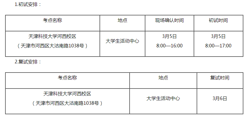 (3)現場確認:已完成網上報名和繳費的考生,持從網上報名系統中打印的報名表和報名所需材料于2018年3月5日8:00—16:00到天津科技大學河西校區大學生活動中心(天津市河西區大沽南路1038號)進行現場確認,打印準考證,參加初試。