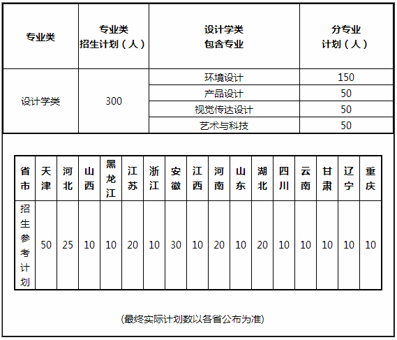說明:當我校“綜合成績”計算方法與生源所在省、自治區、直轄市計算方法沖突時,按生源所在省計算方法為準。學校錄取時按專業類(設計學類)錄取,最終解釋由省招生主管部門和學校招生辦公室負責。
