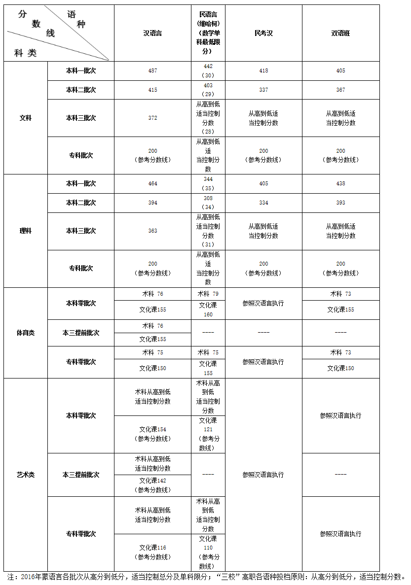 新疆維吾爾自治區2016年普通高校招生各批次最低投檔控制分數線
