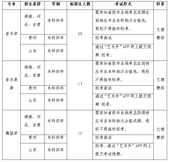 六、志愿填報及錄取原則(一)湖南省、河北省、甘肅省的音樂類、舞蹈類考生須參加生源所在省(直轄市、自治區)統一組織的相應專業課統考且達到相應專業本科批次合格線,并參加全國普通高考文化課統一考試,方可填報我校音樂類、舞蹈類相應專業志愿。