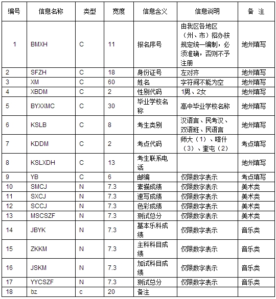 新疆自治區2017年美術類、音樂類專業統考報名考生信息備案數據庫結構