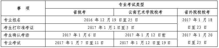注:經(jīng)省招考院同意,云南省 2017 年藝術(shù)類專升本專業(yè)統(tǒng)一考試定于 2017 年 1 月 18 日至 19 日在云南藝術(shù)學(xué)院呈貢校區(qū)舉行,具體報考流程按照省招考院相關(guān)規(guī)定辦理。