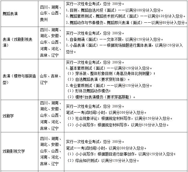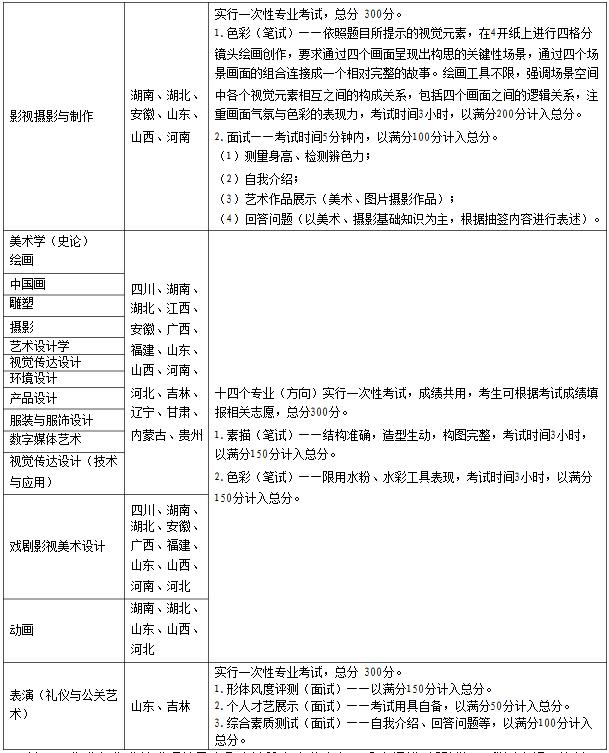 今年,我校藝術類本科專業省外面向四川、貴州、湖南、湖北、江西、安徽、廣西、福建、山東、山西、河南、河北、吉林、遼寧、甘肅、內蒙古等 16 個省(區)招生。各省(區)均設有專業考點,考生只能在生源所在地考點參加專業考試,在生源地以外考點參加專業考試的考生考試成績我校不予承認,責任由考生自負。
