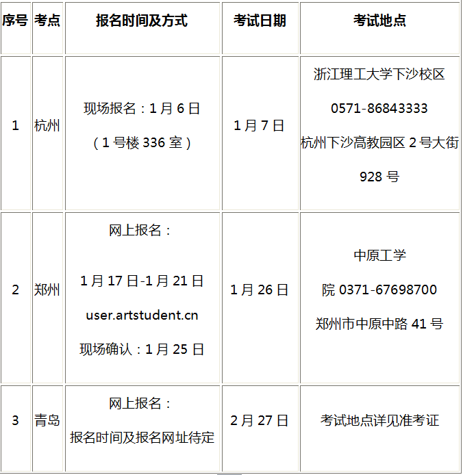 注:1)杭州考點同時承擔浙江省時裝表演類專業省統考,浙江考生只能選擇在杭州考點參加考試;